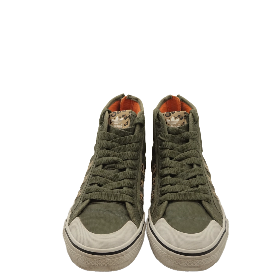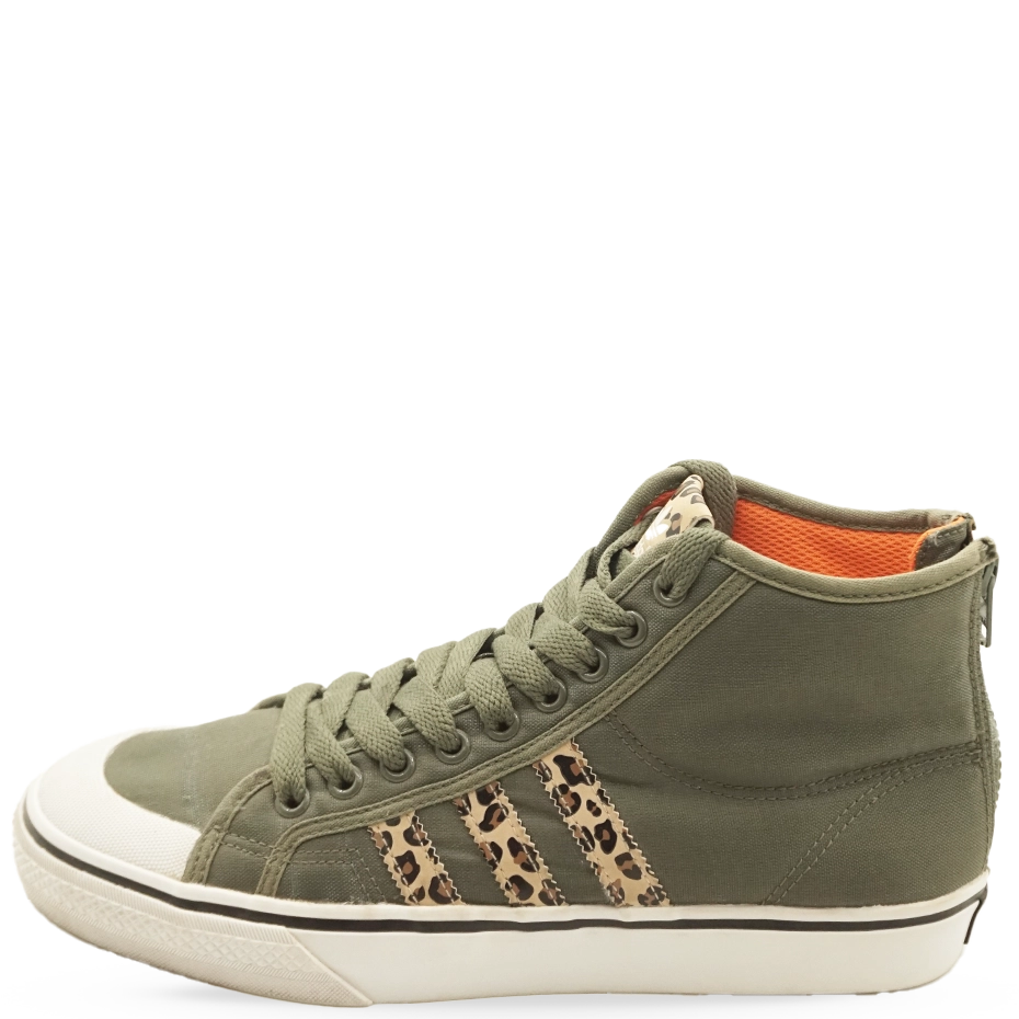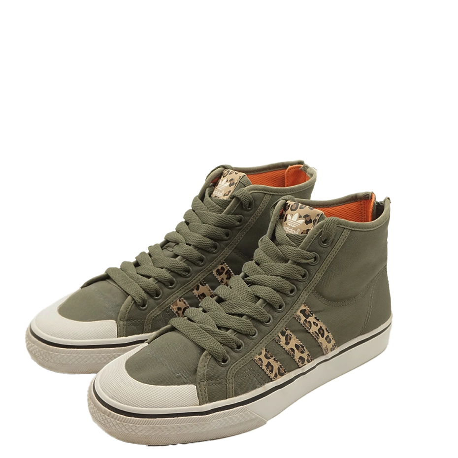 Šie adidas Nizza aukšto aulo kedai turi chaki spalvos drobinę viršuinę dalį su leopardiniu 3 juostelių raštu, juodą Nizza logotipu pažymėtą padą ir užtrauktuką gale. Sustiprinta guminė noselė suteikia ilgaamžiškumo ir retro stiliaus akcentą.