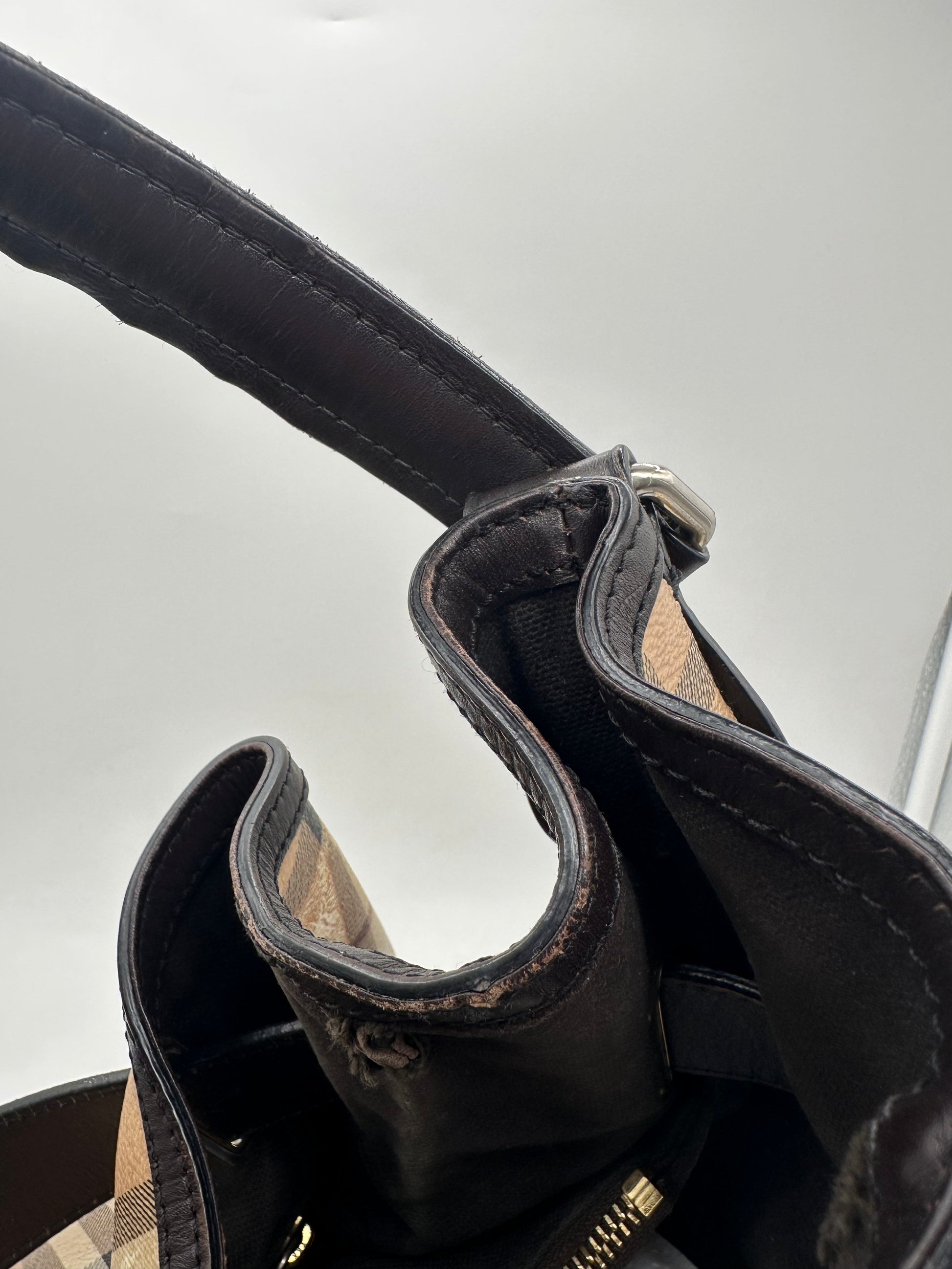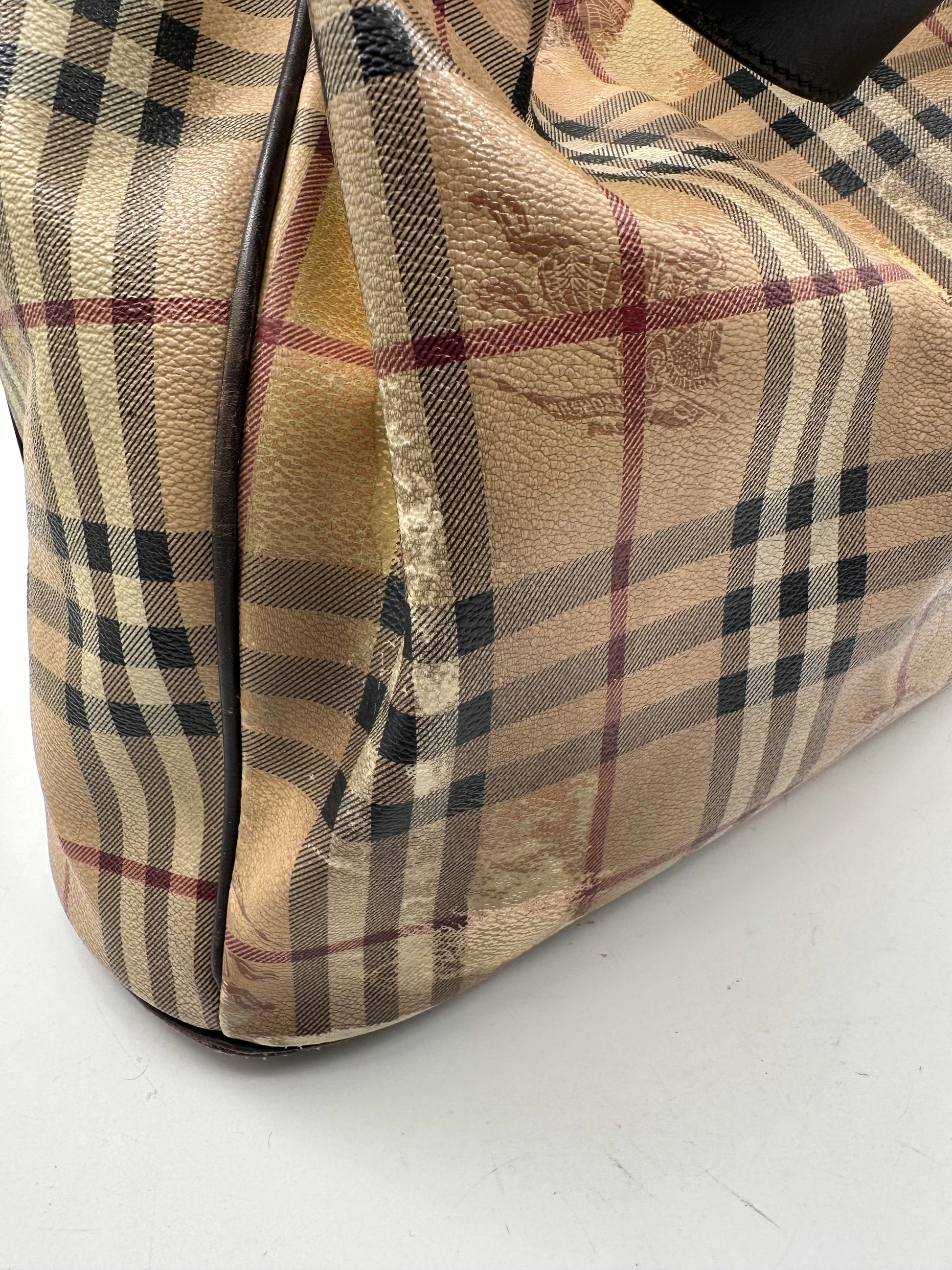 Burberry Haymarket Check belted tote. Single handle and gold-tone hardware accents.