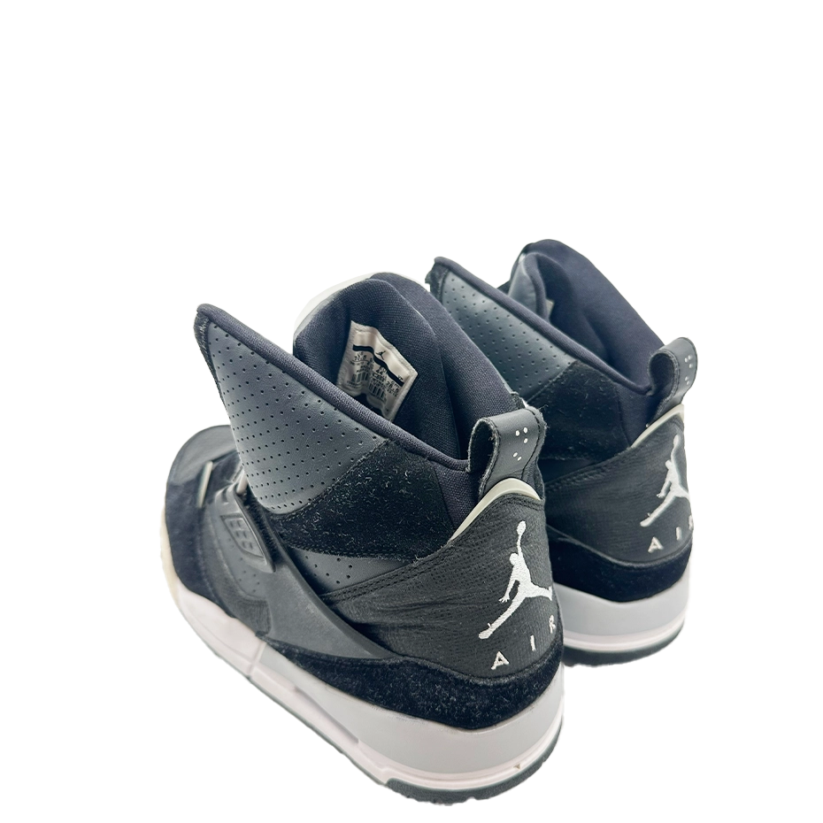 The Nike Air Jordan Flight 45 High elevates the classic Flight 45 with higher ankle support, an adjustable mid-foot strap with embossed Jordan logo, and a premium leather and suede upper. Finished in black with grey and white midsole accents, it features a leather tongue with Jumpman and embroidered ‘Flight’ logo.