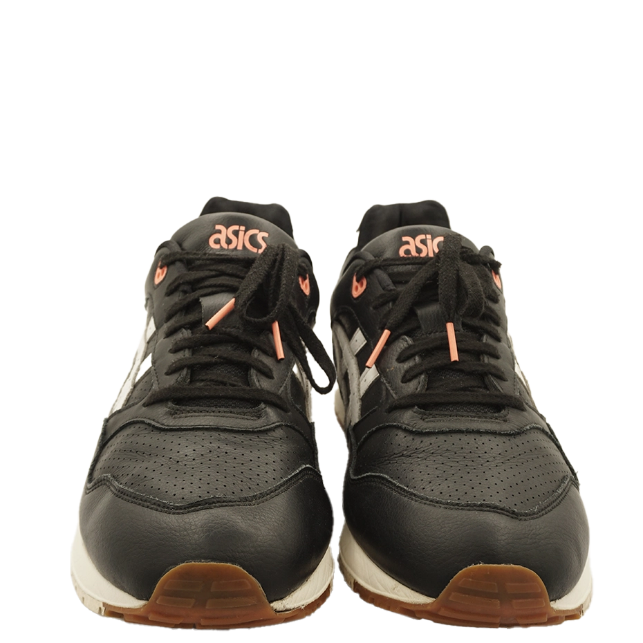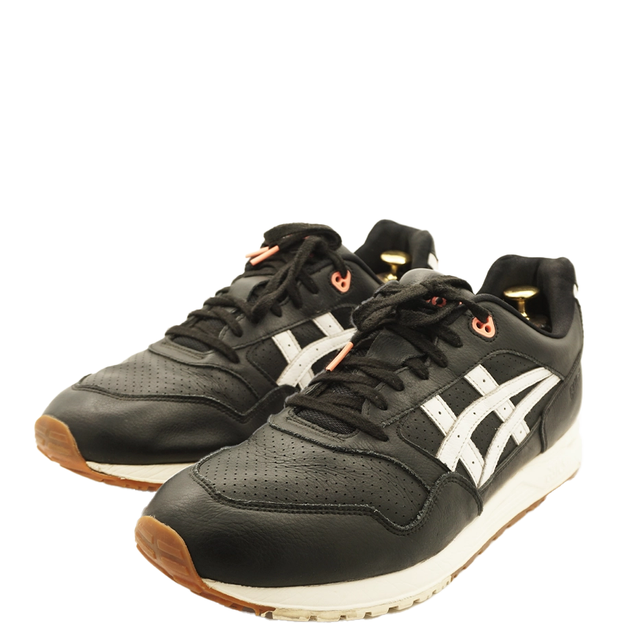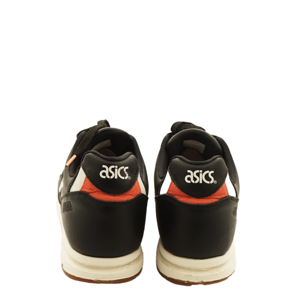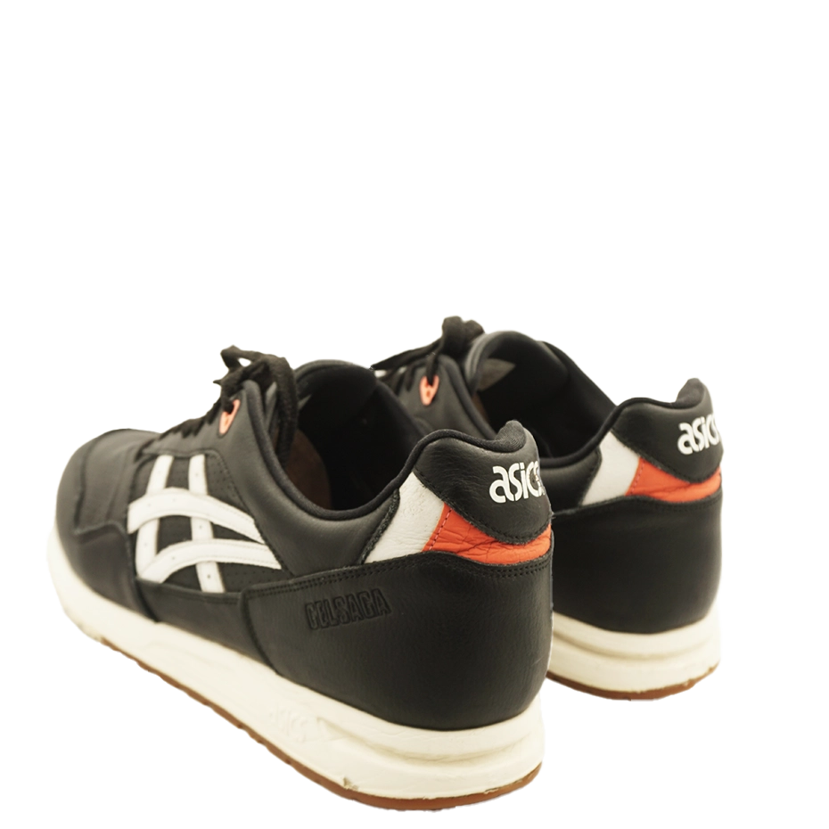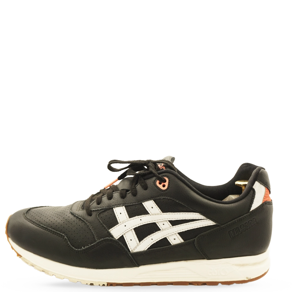 The ASICS Gel-Saga “Black” features a perforated Tiger Stripes design for breathability and a sleek black leather upper accented with white and fiery red. It includes a traditional tongue and collar, GEL cushioning, and an EVA midsole.