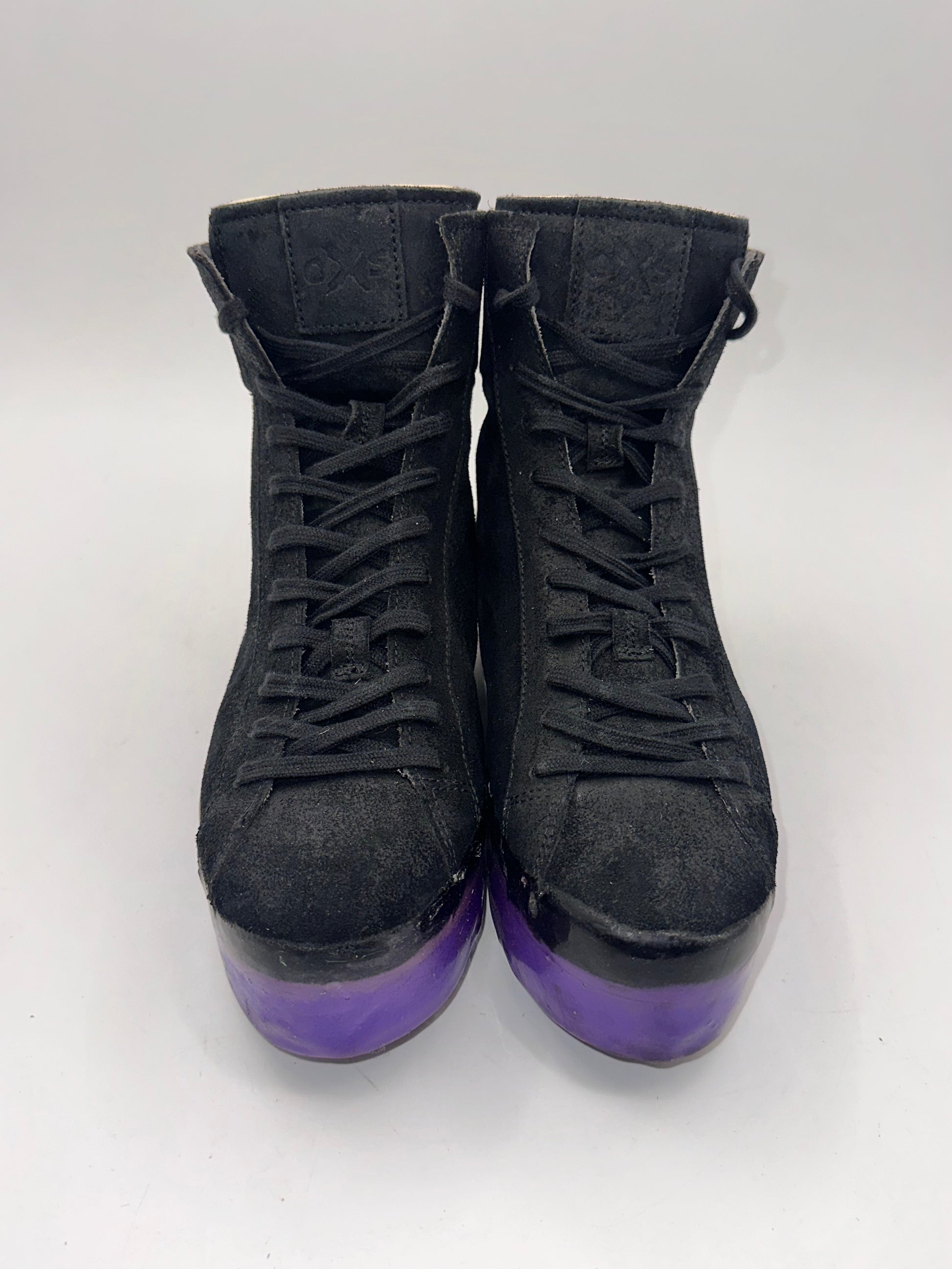 O.X.S. black suede high-top sneakers with a purple jelly-like sole.