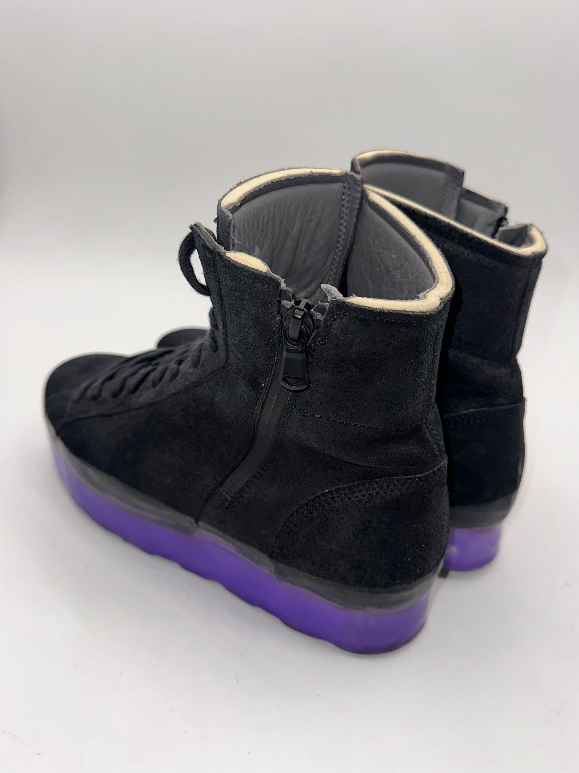 O.X.S. black suede high-top sneakers with a purple jelly-like sole. The item is in VERY GOOD con...