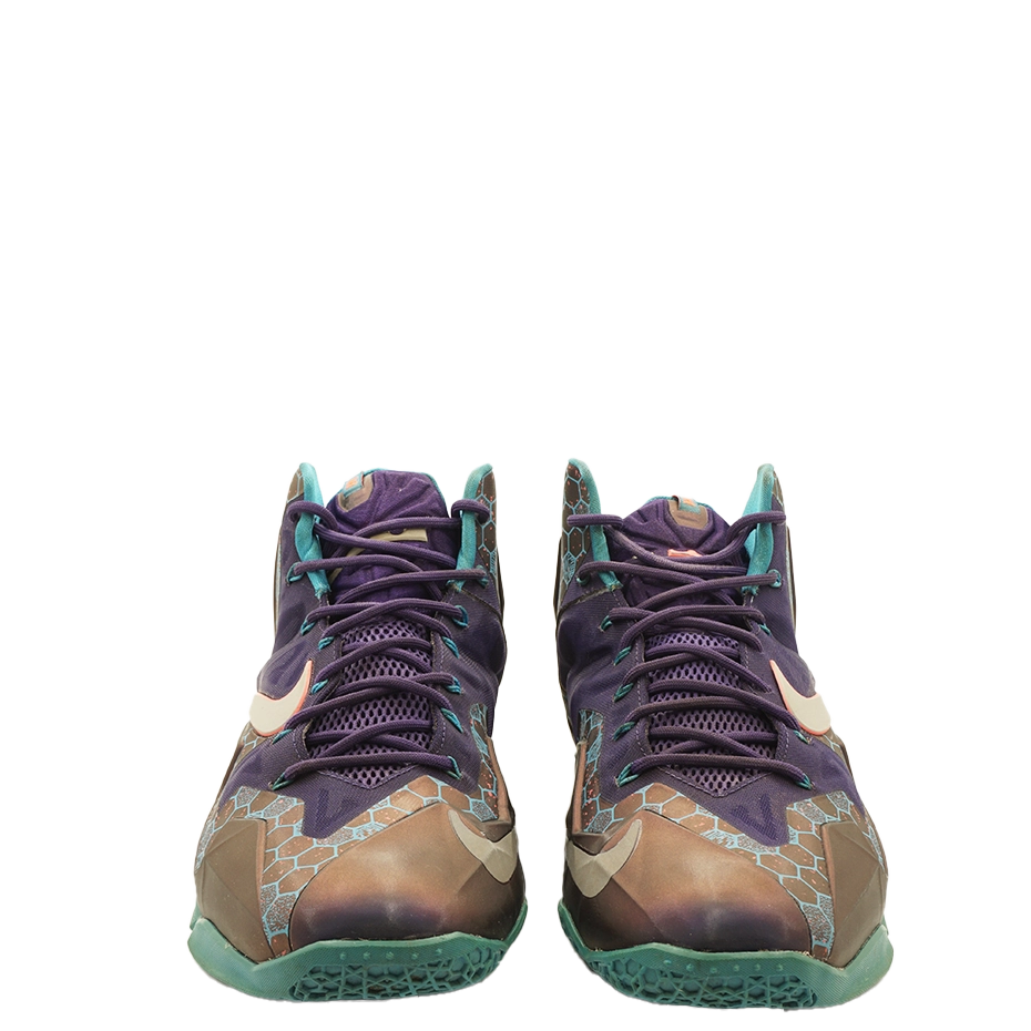 This Nike LeBron 11 colorway revisits the classic Summit Lake Hornets theme, honouring James’ youth team with a blue and purple beehive hexagonal pattern on the upper. Purple Armorposite and mesh materials are accented by blue and pink details. Built with Posite, Fuse, and Dynamic Flywire technologies, these basketball shoes deliver a secure, performance-driven fit.