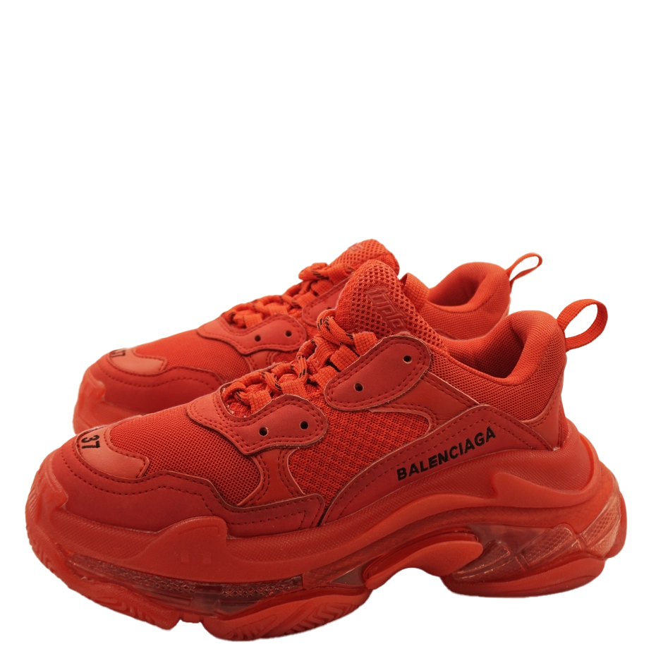 These Balenciaga Triple S sneakers feature a fire red upper made of premium leather and a transparent sole with a platform.